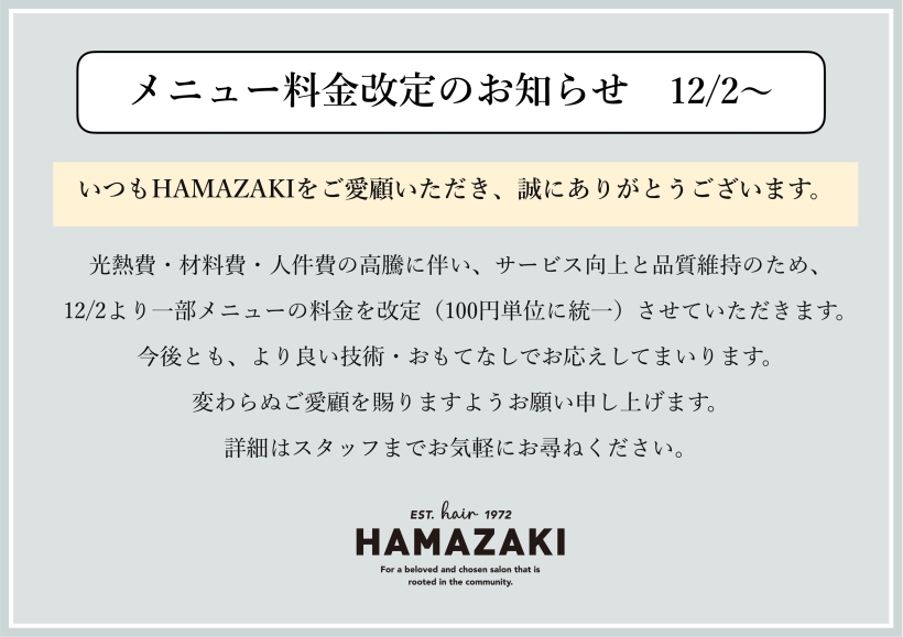 光熱費・材料費・人件費の高騰に伴い、サービス向上と品質維持のため、12/2より一部メニューの料金を改定(100円単位に統一)させていただきます。